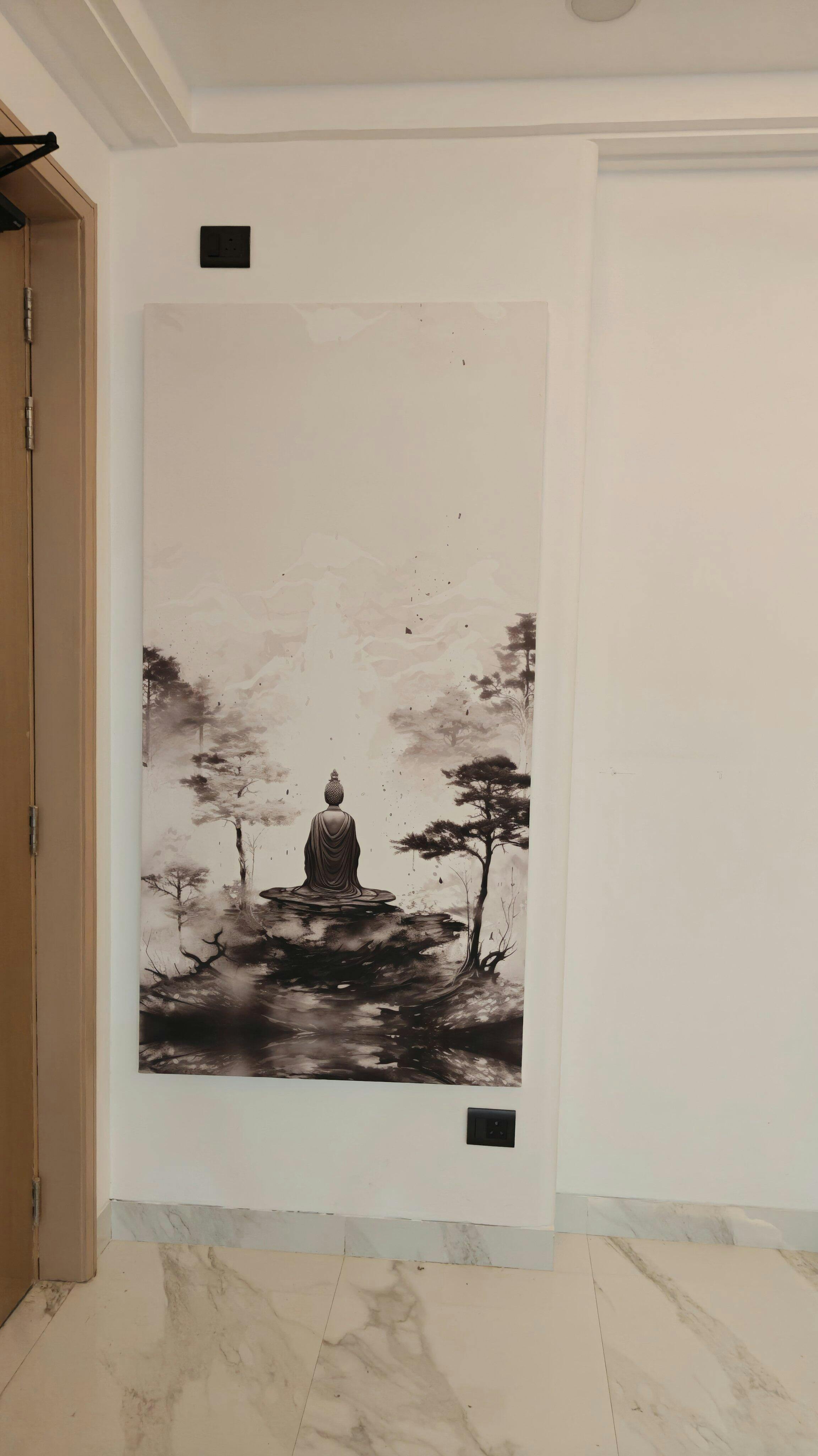 This canvas print beautifully captures a serene and meditative scene featuring a silhouette of Buddha seated in deep contemplation. Rendered in monochrome tones, the artwork evokes a sense of calm and mindfulness. Surrounding Buddha are ethereal trees and misty mountains, blending seamlessly into soft, watercolor-like brush strokes that symbolize harmony between nature and spirituality.