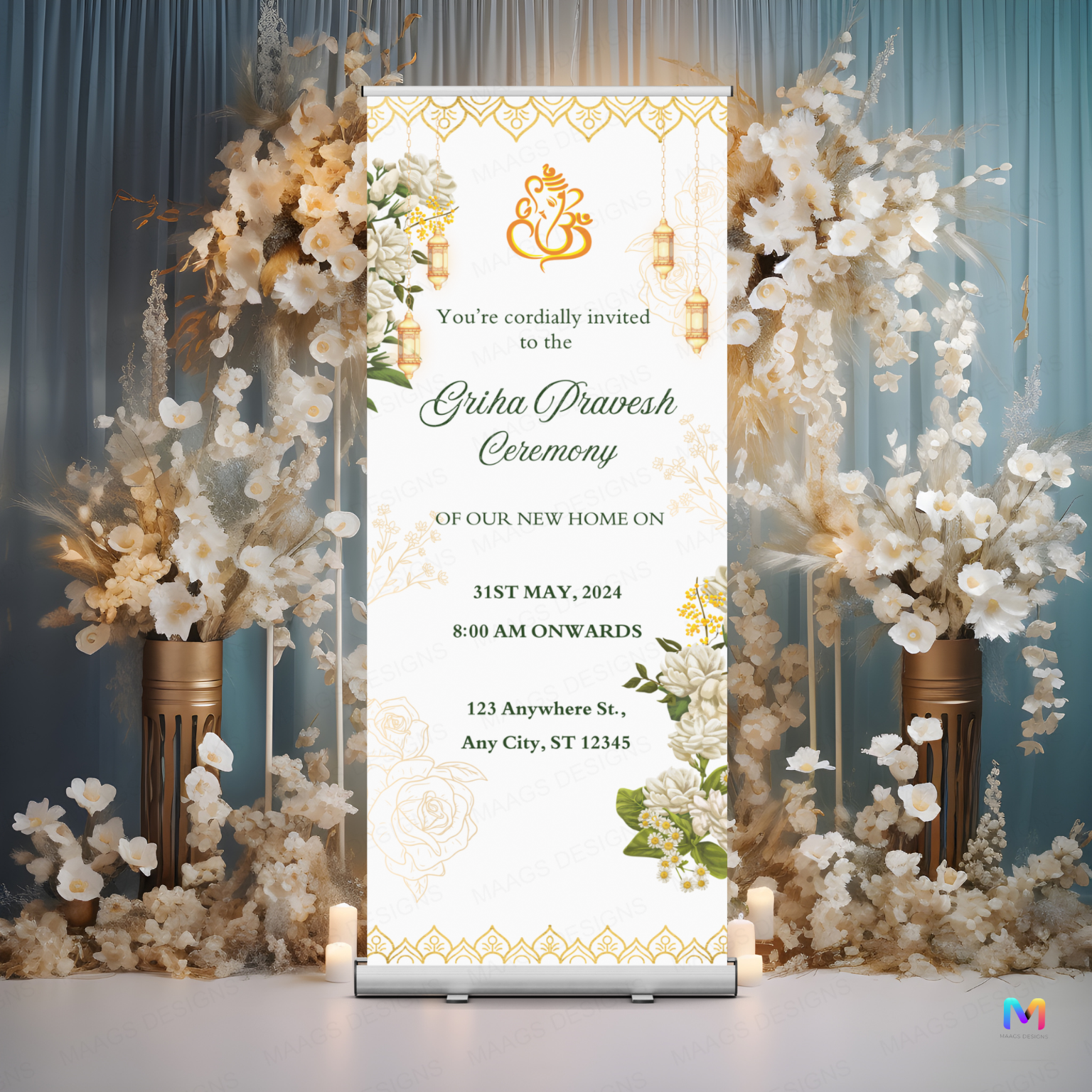 Celebrate your special housewarming with the Housewarming Banner Standee - #HW01. Crafted for elegance and ease, this standee provides a beautiful backdrop that enhances your event’s ambiance. Its sturdy construction ensures stability throughout the celebration, while the vibrant design adds a festive touch. Perfect for capturing memorable photos and creating a warm, welcoming atmosphere for guests.